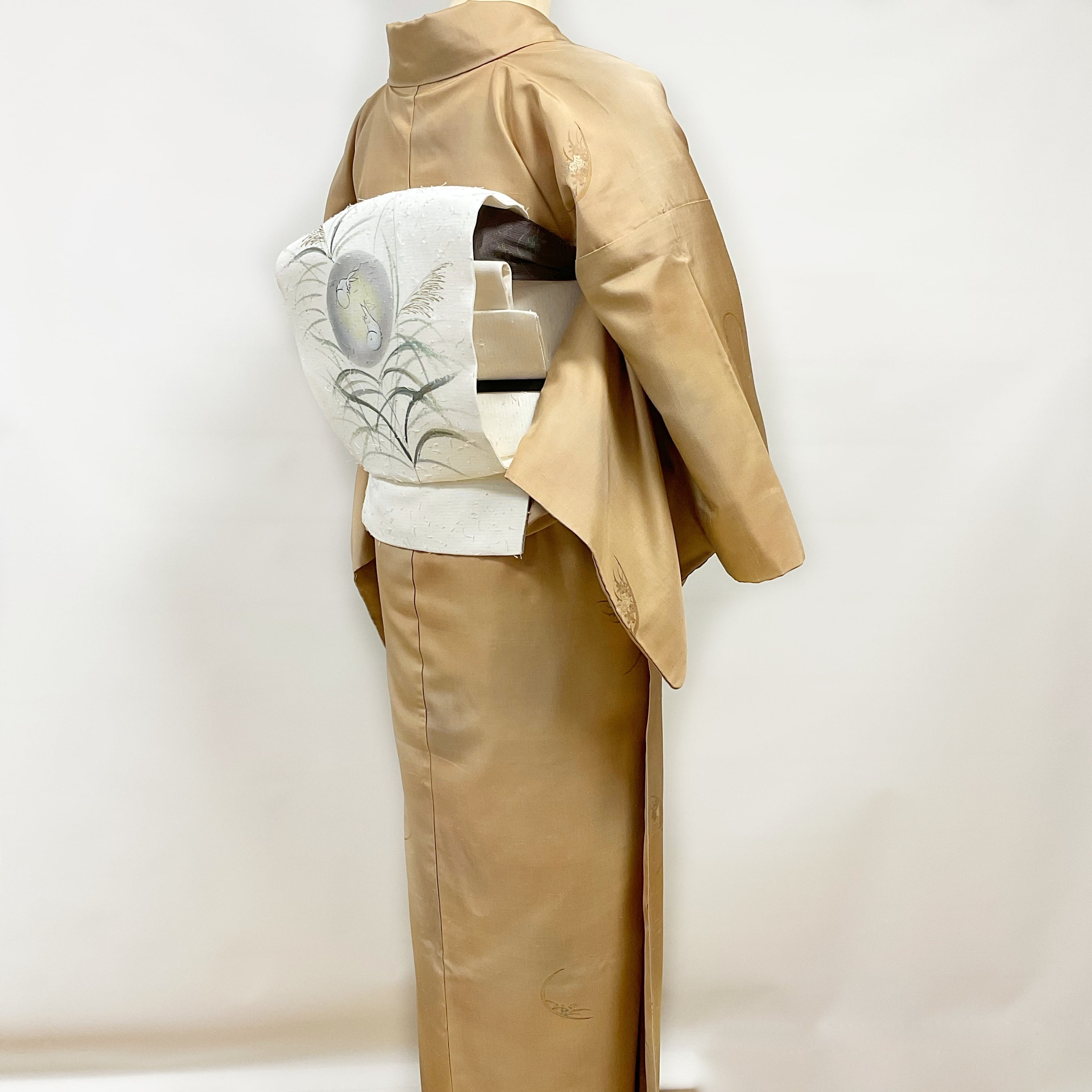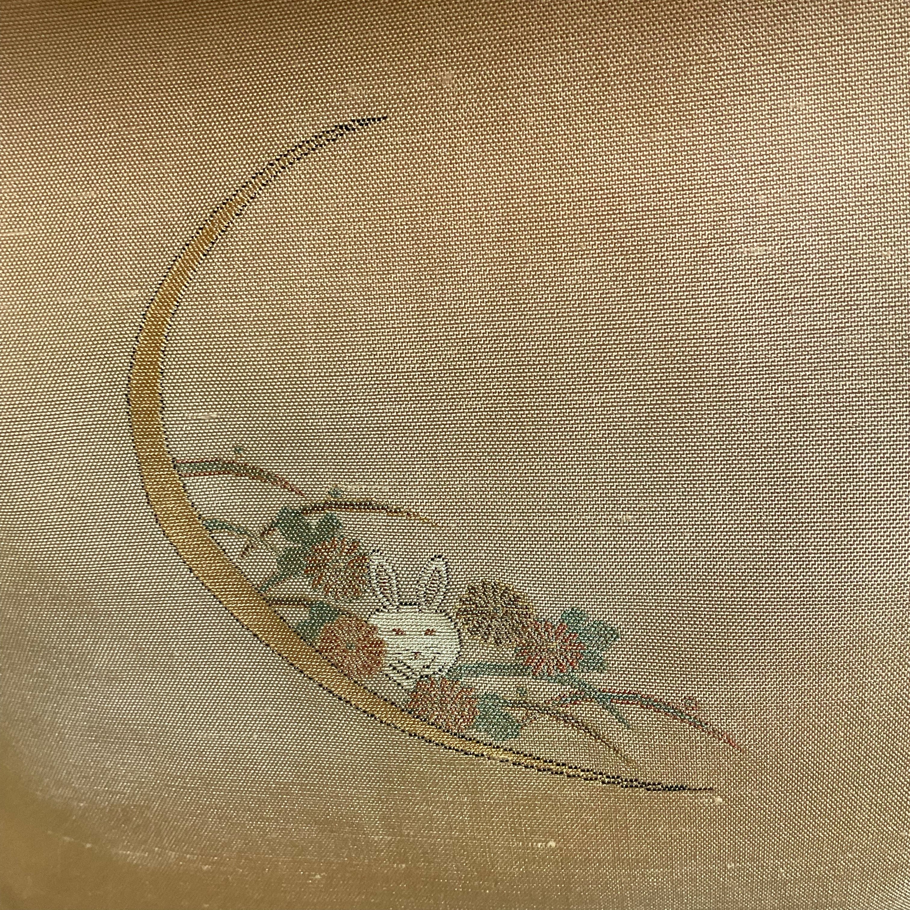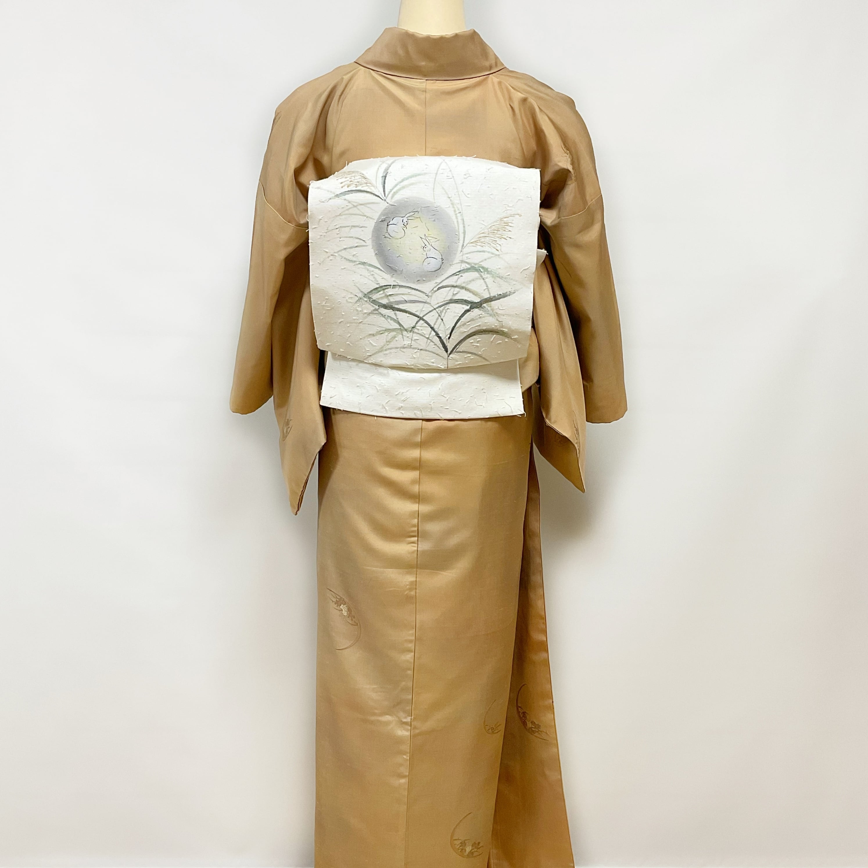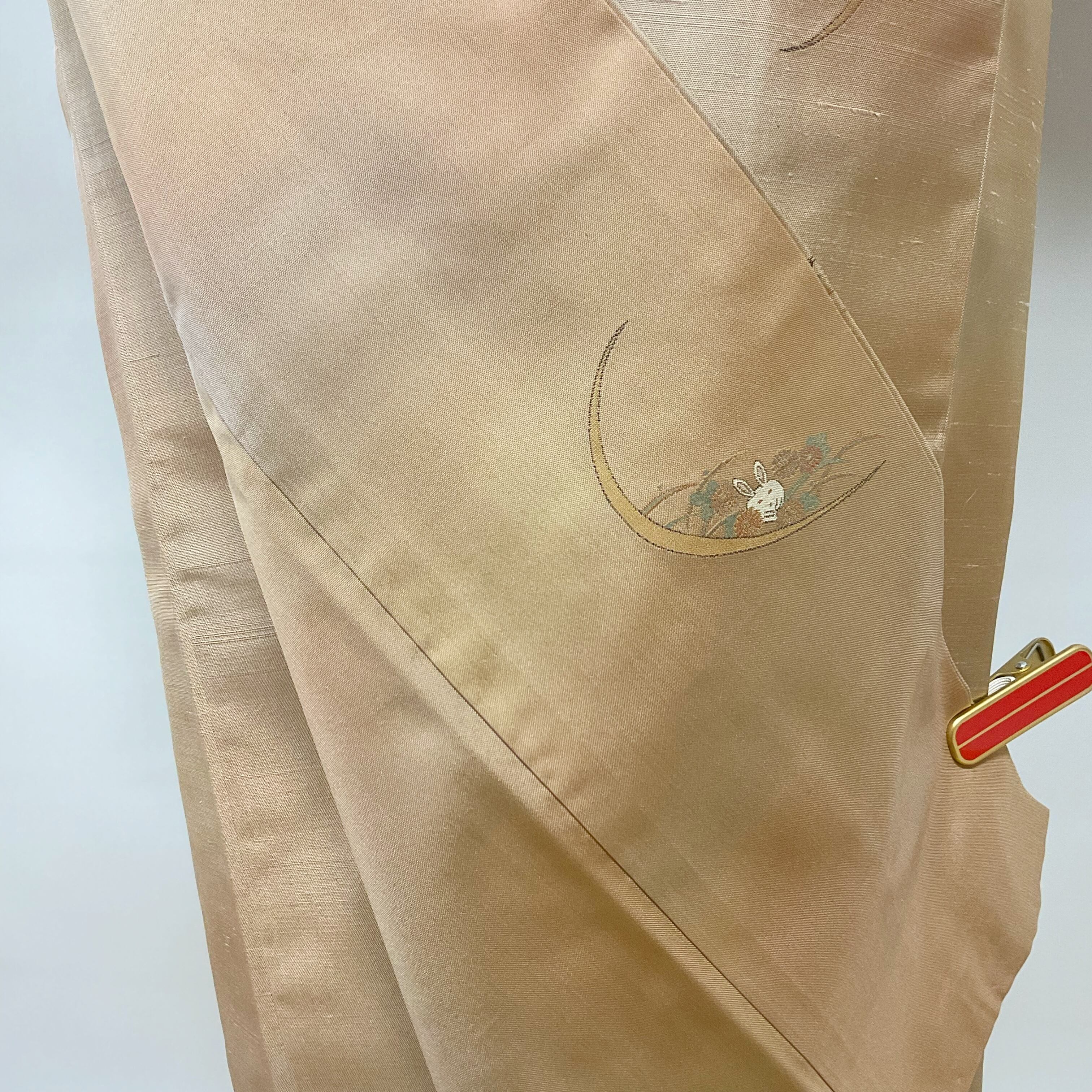 櫨色(はじいろ)と薄紫色のぼかし地に、うさぎ・月・菊などが織り込まれた可愛らしくも上品な一品。