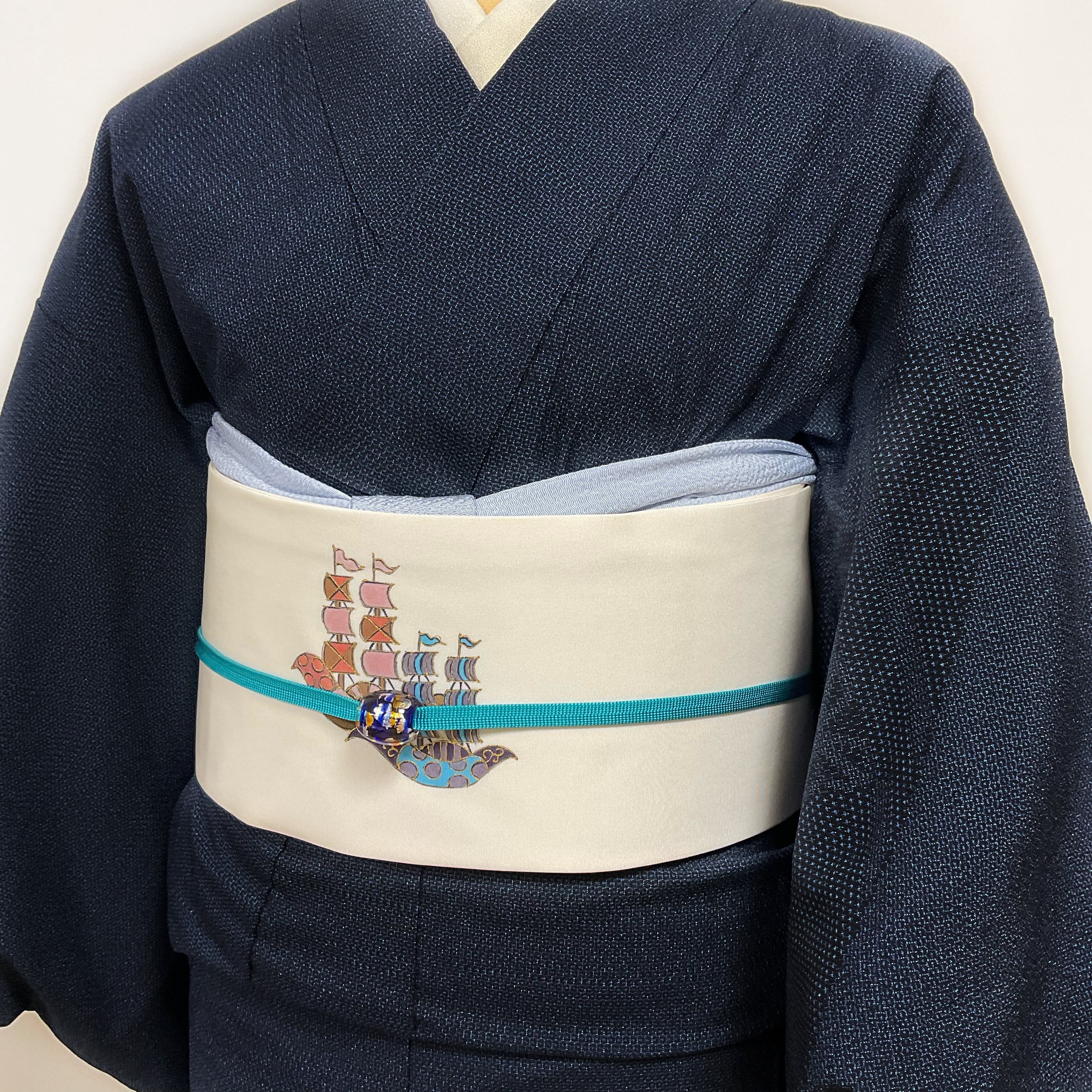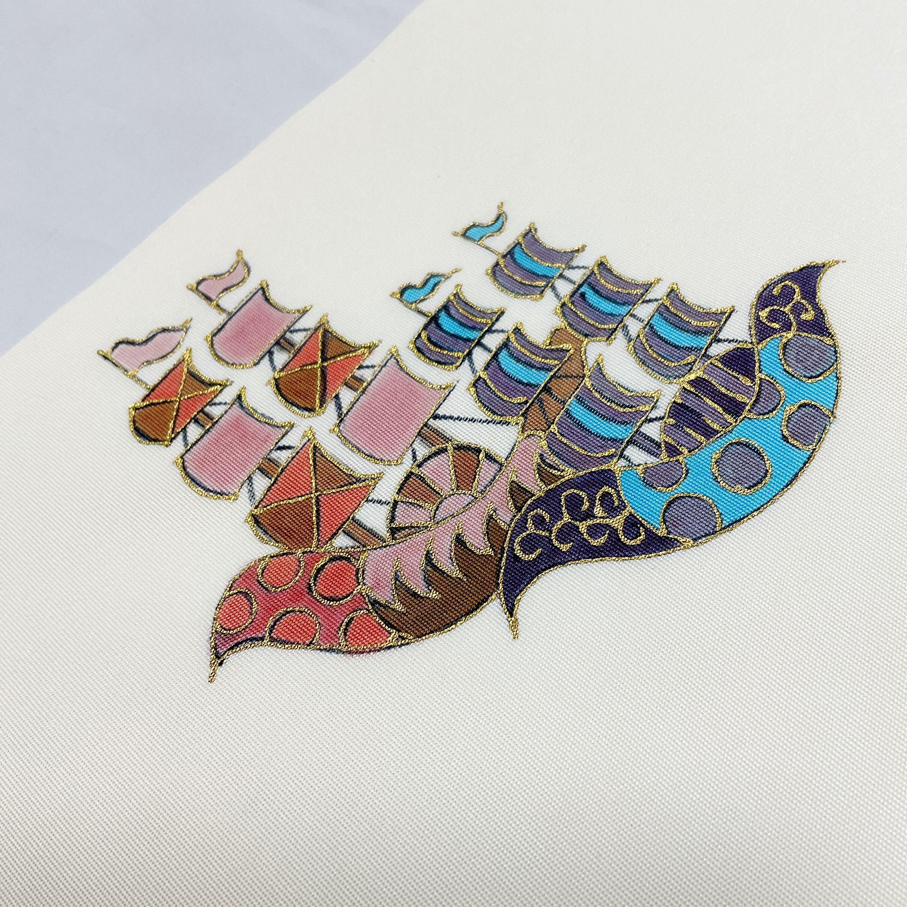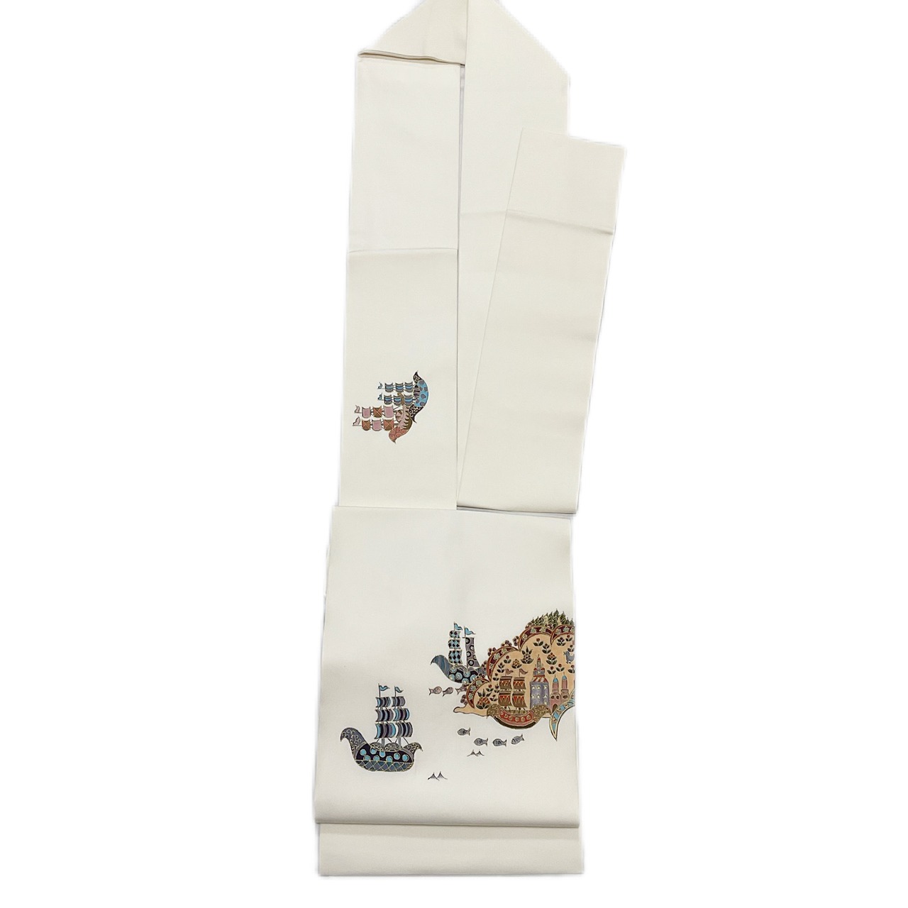 【211552】塩瀬 名古屋帯 象牙色 帆船柄 エキゾチック