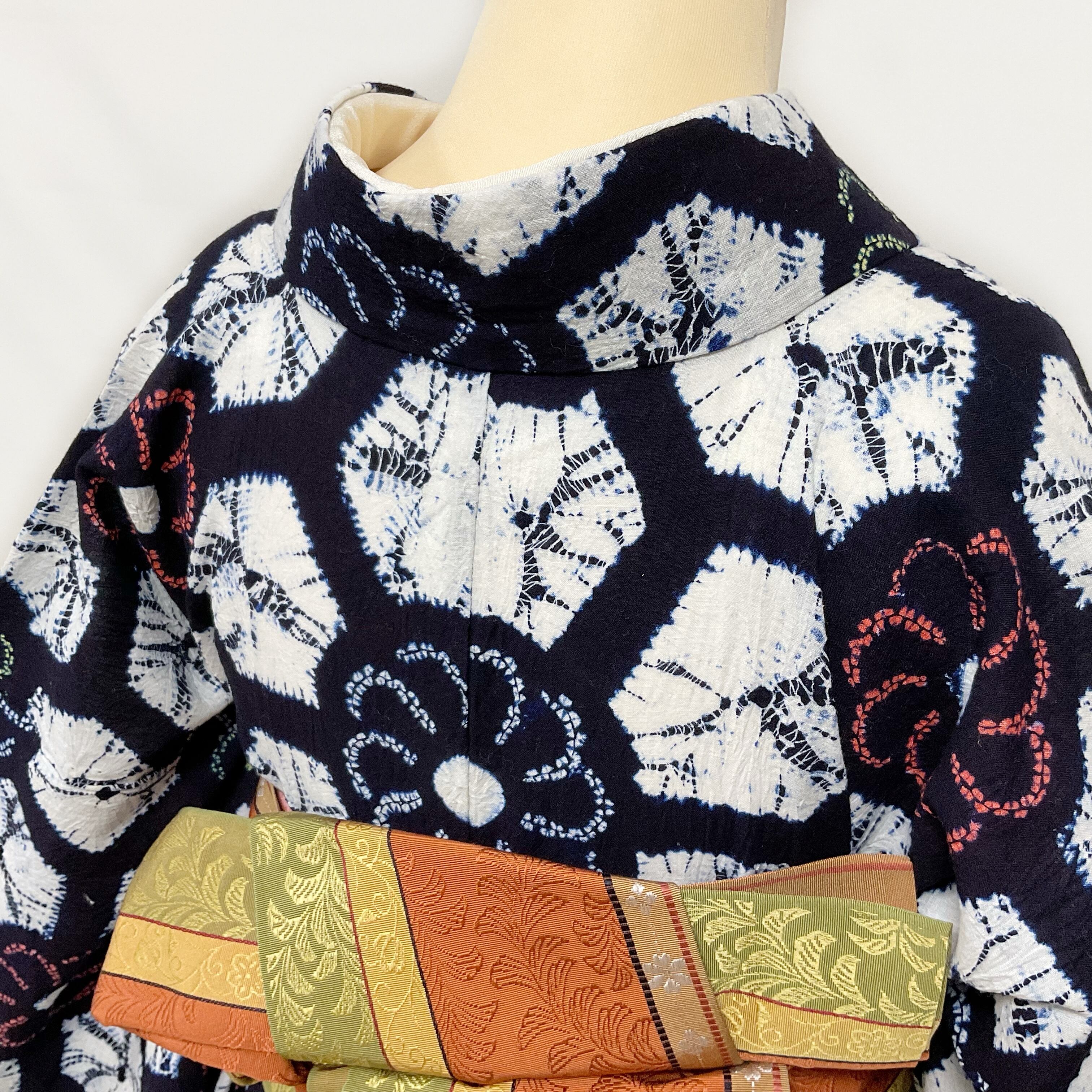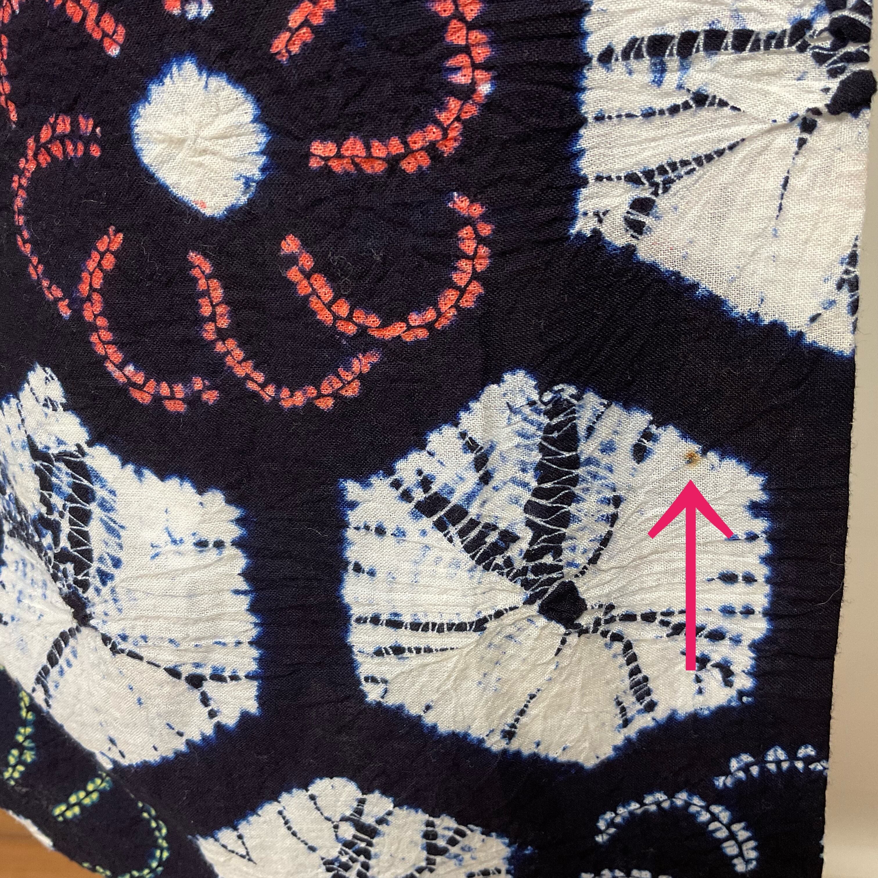 状態:リユース商品 絞り染めの際の針穴がにうっすら変色が見られる箇所がありますが、着用の際に気になる程度ではありません(写真9・10枚目)