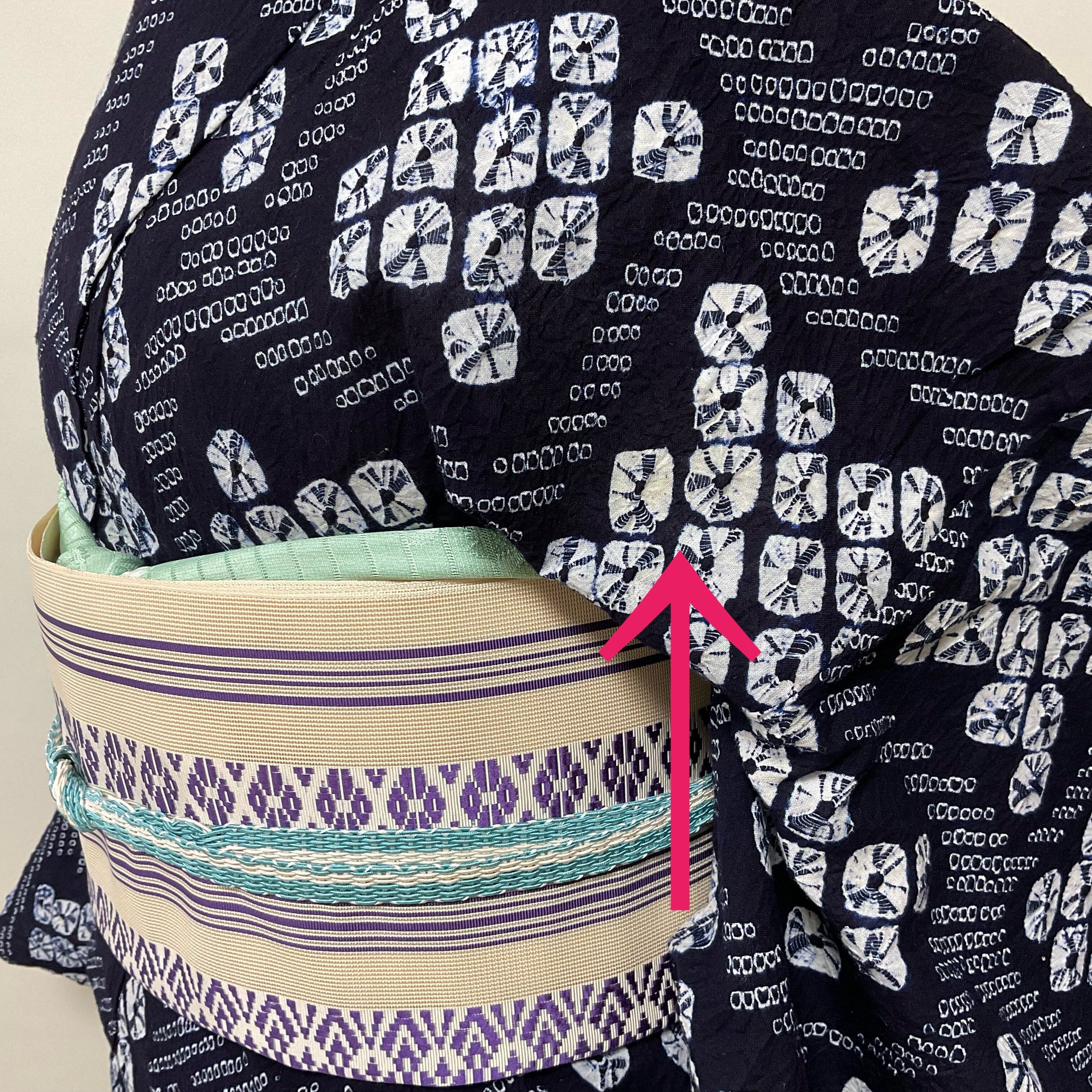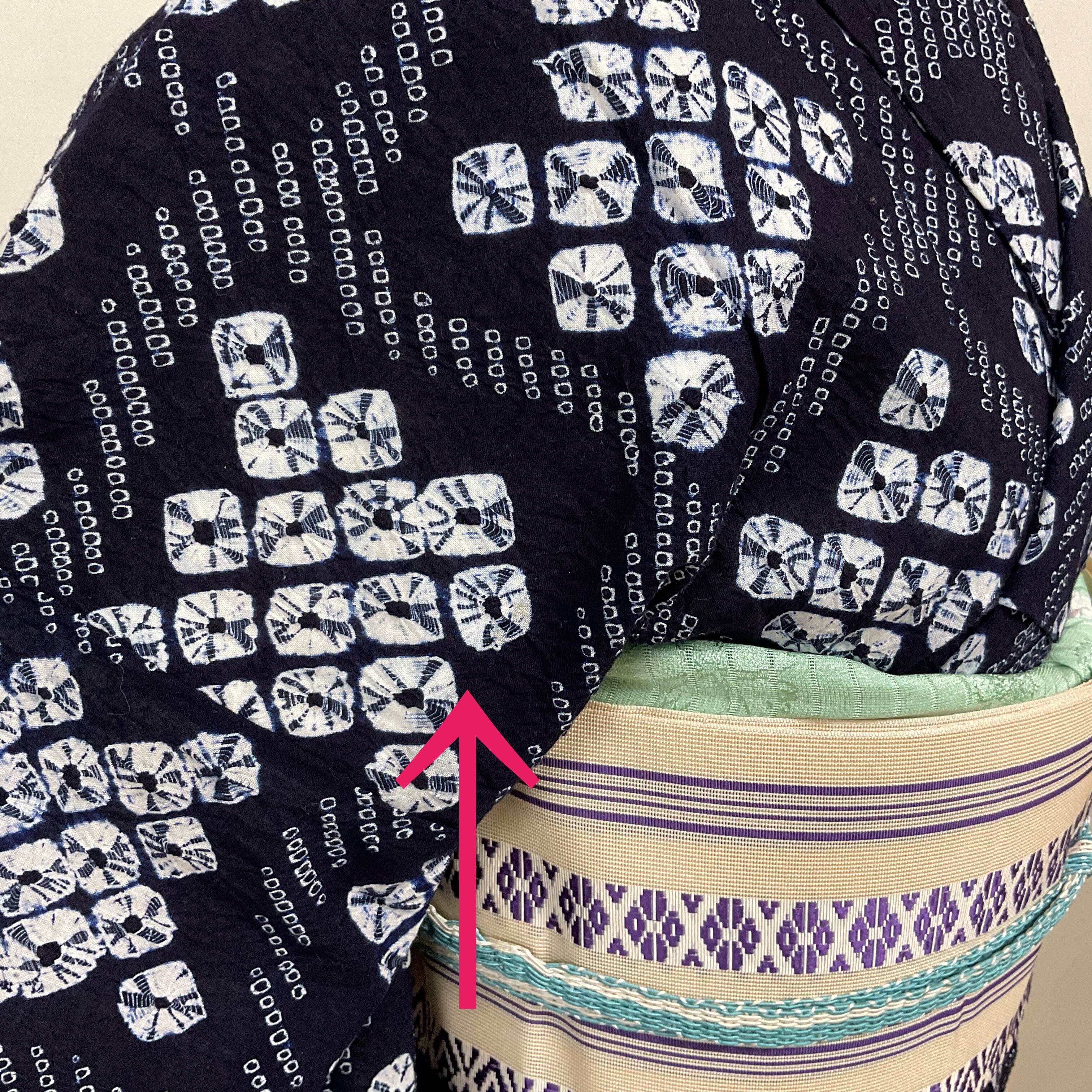絞り染めの際の針穴がにうっすら変色が見られる箇所がありますが、着用の際に気になる程度ではありません(写真14枚目)