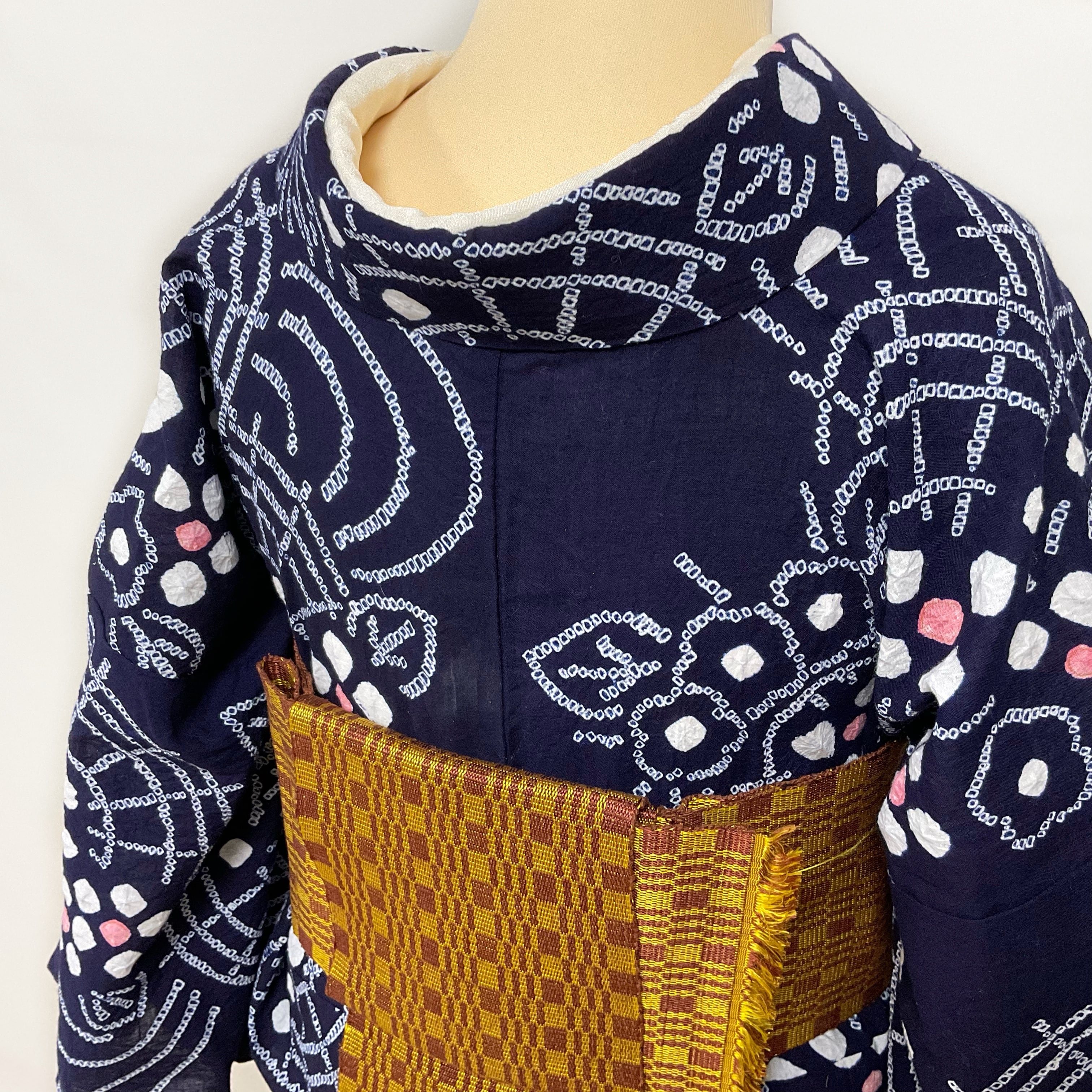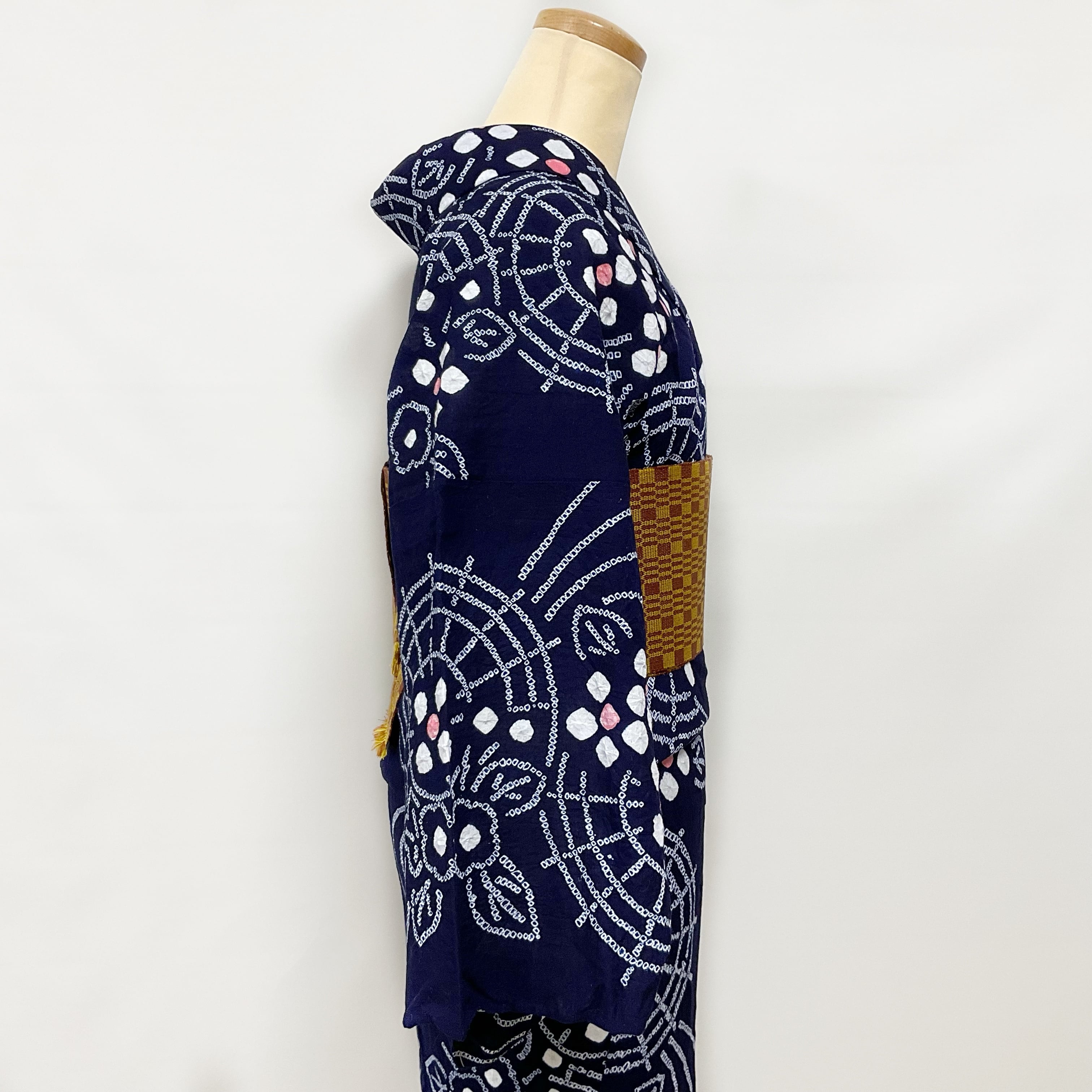 染めムラや、絞り染めの際の針穴がにうっすら変色が見られる箇所がありますが、着用の際に気になる程度ではありません(写真2枚目など)
