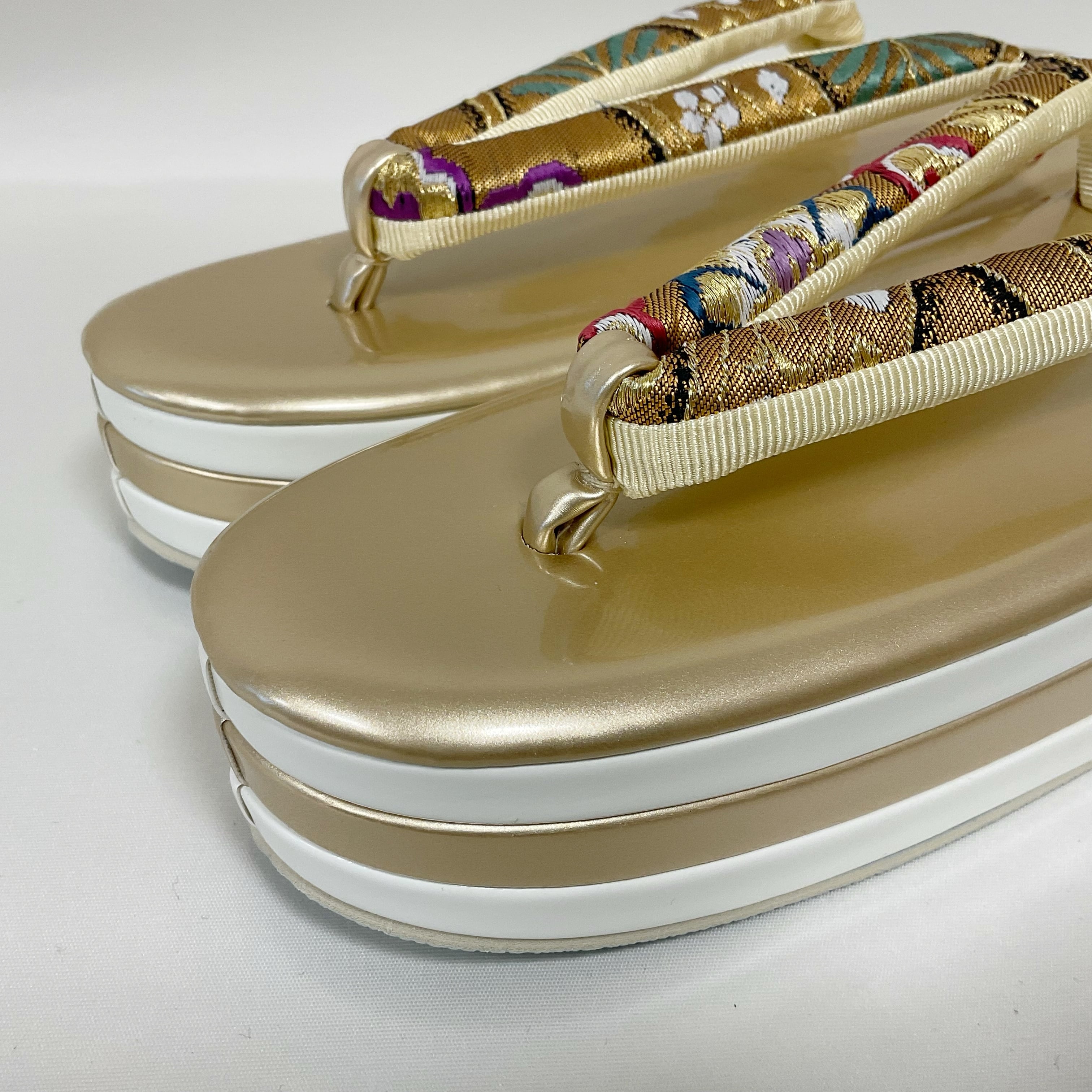 ゴールドと白の3段草履ですので、振袖や訪問着などに合わせていただけます