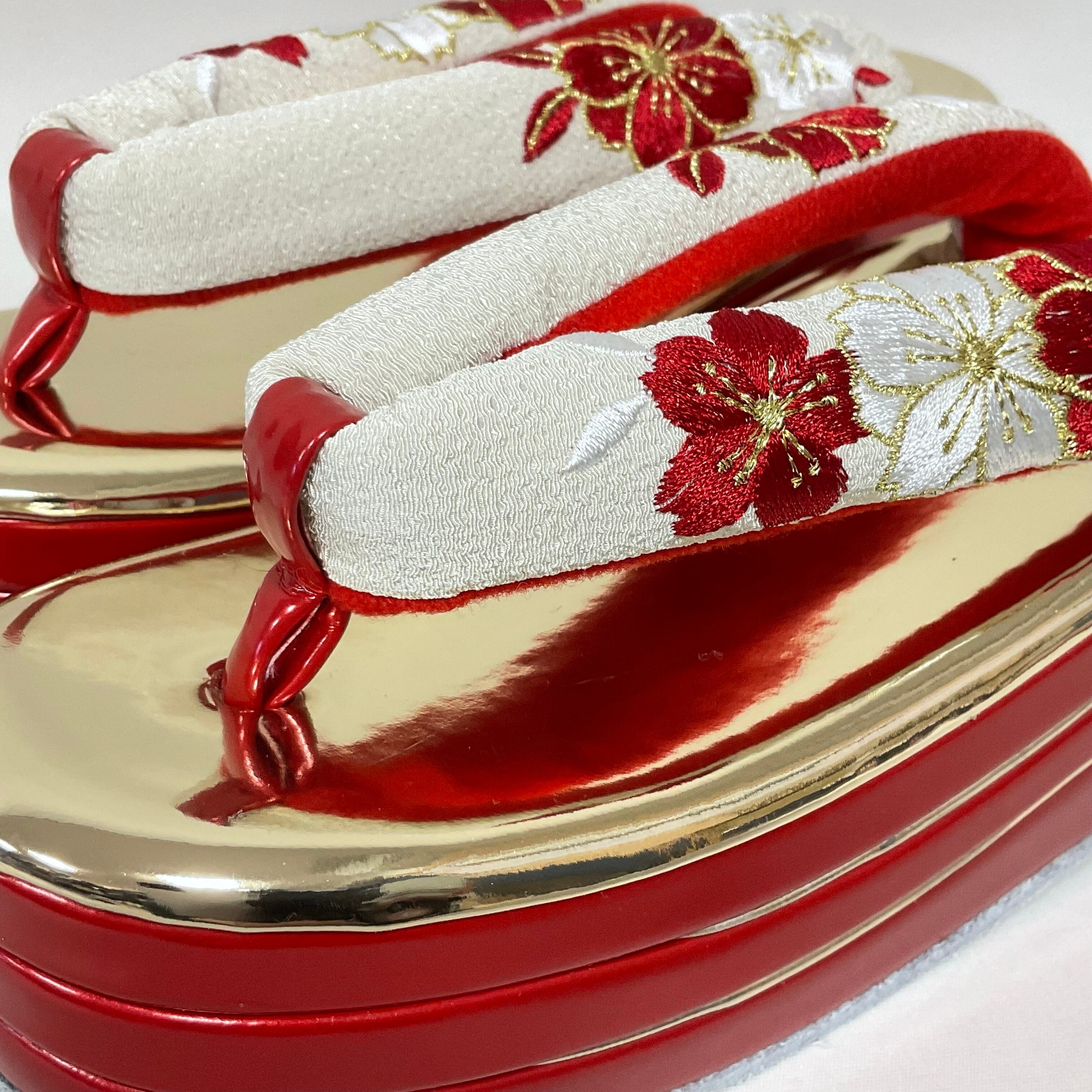 ゴールドと赤の3段草履ですので、振袖に合わせていただけます